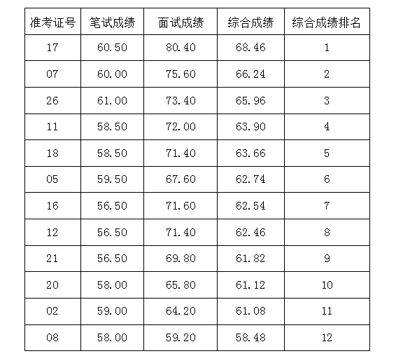 根據《大龍窩索道公司技術員招聘公告》,按筆試成績與面試成績6:4權重計算綜合成績,現公告如下: