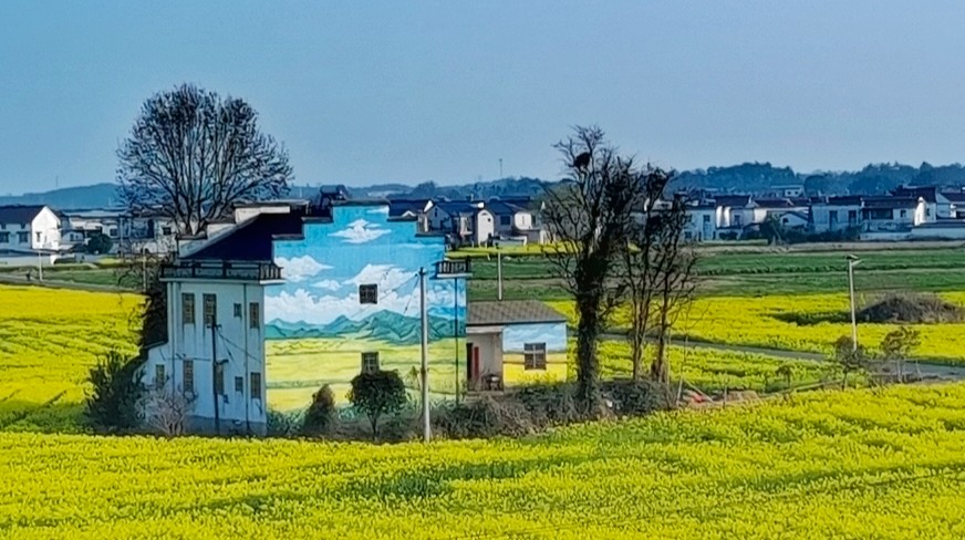 遠(yuǎn)處農(nóng)家白墻灰瓦錯落有致,
